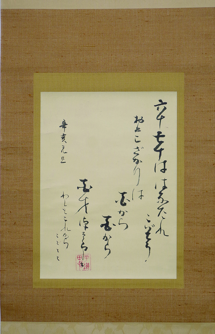 実業家その他 平櫛田中 和歌幅 「六十七十は はなたれこぞう おとこざかりは 百から百から」 ¥77,000 基本情報 紙本 二重箱 軸先 象牙 本紙寸法 33×24 表装寸法 119×44 特記 昭和46年100歳書 彫刻家、岡山生、師中谷省古、人間国宝 平櫛田中 和歌幅 「六十七十は はなたれこぞう おとこざかりは 百から百から」個 お買い物カゴに追加 商品コード: kowa0035 カテゴリー: 実業家その他, 新入荷, 書物 関連商品 東郷吉太郎 「以春風接人」一行書幅 ¥16,500 お買い物カゴに追加 賀茂季鷹 詠池岸有松鶴和歌幅 ¥11,000 お買い物カゴに追加 井上士朗 不二俳画幅 「澤山な月日が出来て梅の花」 ¥22,000 お買い物カゴに追加 大伴大江丸 俳画幅 ¥11,000 お買い物カゴに追加