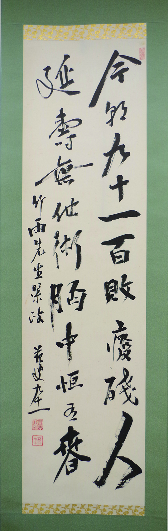 実業家その他 徳富蘇峰 土屋竹雨先生槃歧詩幅 ¥33,000 基本情報 紙本 軸先 本紙寸法 136×35 表装寸法 200×53 特記 91歳書 評論家、熊本県生、徳富蘆花の兄 徳富蘇峰 土屋竹雨先生槃歧詩幅個 お買い物カゴに追加 商品コード: kowa9890 カテゴリー: 実業家その他, 新入荷, 書物 関連商品 宇都宮龍山 七絶三行書幅 ¥39,600 お買い物カゴに追加 立花大亀 「一 萬法帰」横幅 ¥49,500 お買い物カゴに追加 大谷光演 「神力演大光」一行書幅 ¥22,000 お買い物カゴに追加 大谷句佛 羽箒句賛幅 「造営の日ながき音を僧房に」 ¥16,500 お買い物カゴに追加