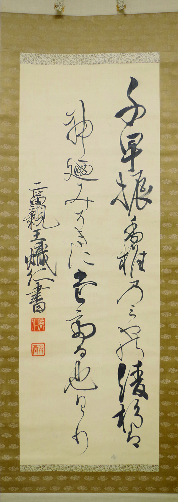 実業家その他 有栖川宮熾仁親王 和歌幅 「千早振 香椎のみやの 綾杉は 神のみそぎに たてる也けり」 ¥16,500 基本情報 絹本 少汚 軸先 本紙寸法 122×43 表装寸法 208×61 特記 幕末・維新期の皇族、陸軍部内の重鎮 有栖川宮熾仁親王 和歌幅 「千早振 香椎のみやの 綾杉は 神のみそぎに たてる也けり」個 お買い物カゴに追加 商品コード: kowa0459 カテゴリー: 実業家その他, 軍人・政治家, 新入荷, 書物 関連商品 セール 寺門静軒 七絶二行書幅 ¥44,000 ¥22,000 お買い物カゴに追加 間宮英宗 「白雲飛去多青山」幅 お買い求めいただきました。 ¥0 続きを読む 松下英麿 和歌横幅 ¥14,300 お買い物カゴに追加 猪瀬北江 「夜静寒巌乕嘯」一行書幅 ¥11,000 お買い物カゴに追加